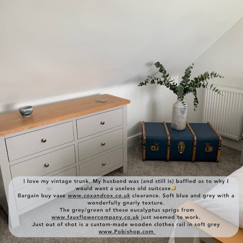 One of my favourite pieces in the room is the vintage blue travel trunk - I would love to know who had owned it and what interesting places it may have been to. I saw it in a vintage shop and loved the colour and the wood trim. I just knew I would find a way to use it in the cottage, so it was squirreled away into storage. My husband is yet to be convinced that my ‘vintage’ finds are anything more than someone else’s rubbish🤣