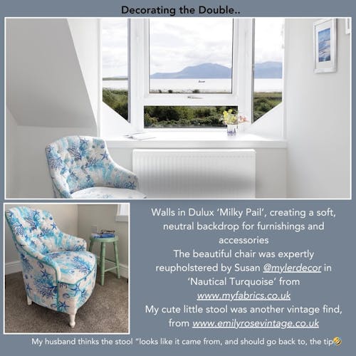 This really was a tricky one, as the room was a difficult shape with odd corners. Also, the chamfered ceiling dictated where I could and couldn’t put furniture. I really wanted the bed opposite the window as the view is gorgeous, but that would have resulted in quite a few bumped heads due to the sloping ceiling. Fortunately, you can still take full advantage of the view from the bed’s current position 🌊 ~ what a treat it is to be able to lie in bed and gaze out at the view and listen to the birds on the shore. I never close the blinds, so I can look out at the night sky - apart from a few sparrows and a passing seagull, noone can see in.